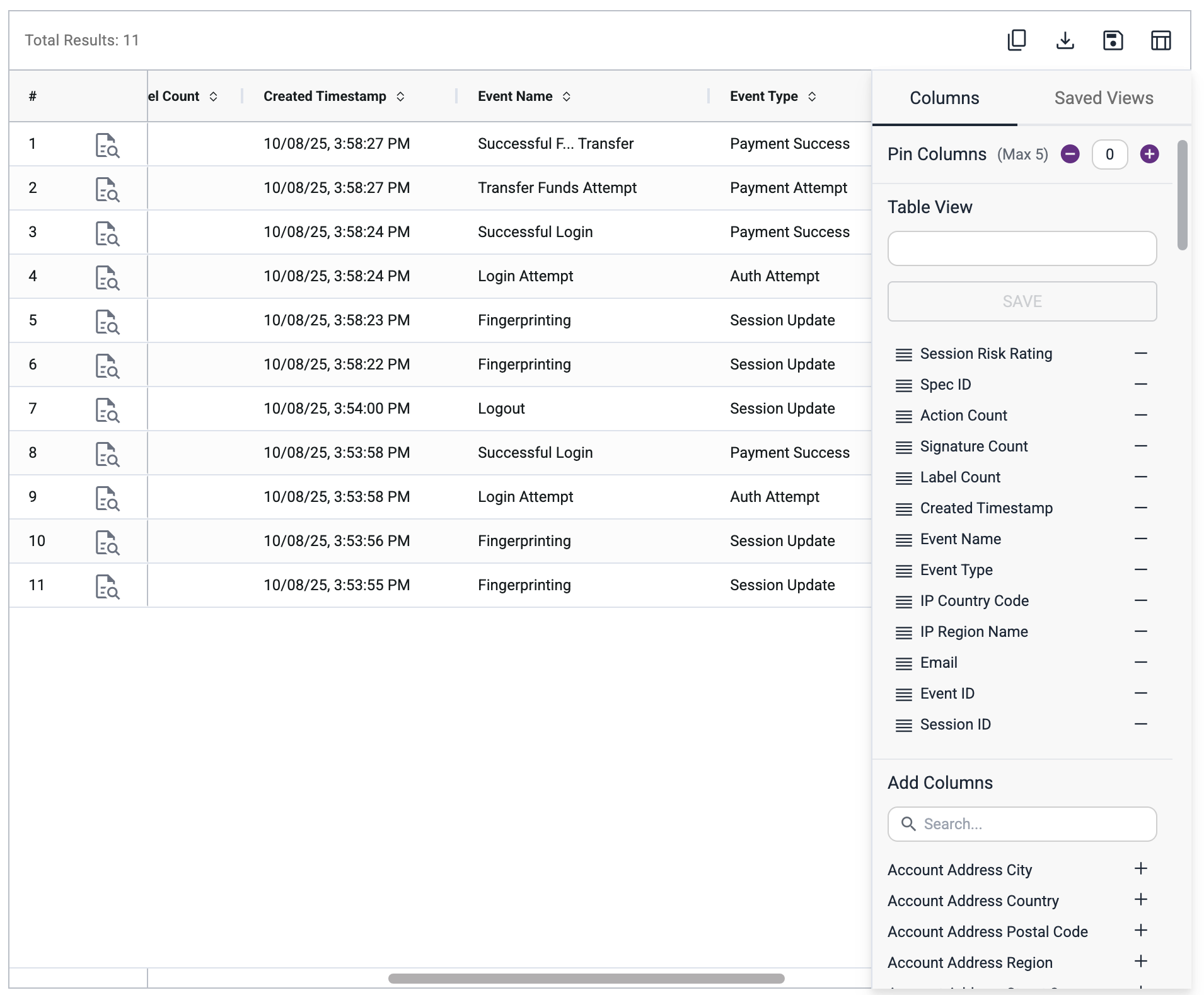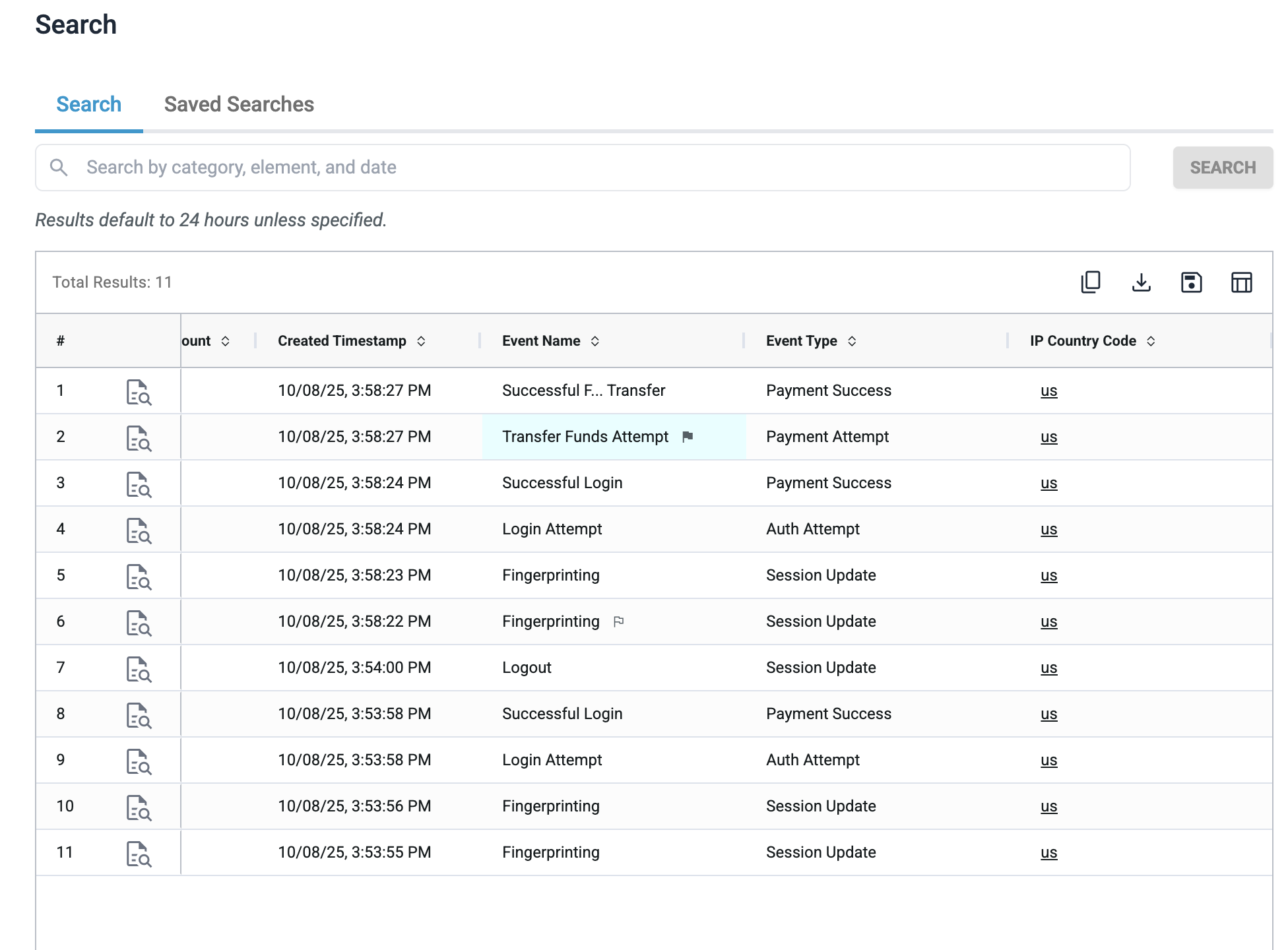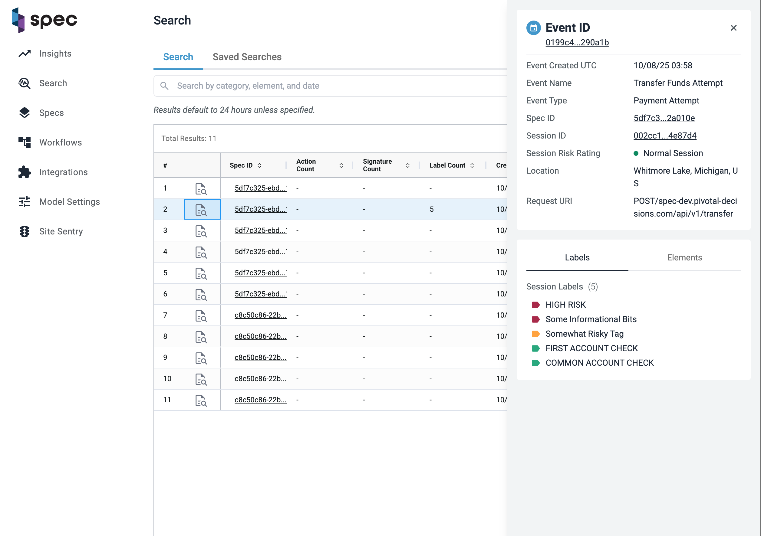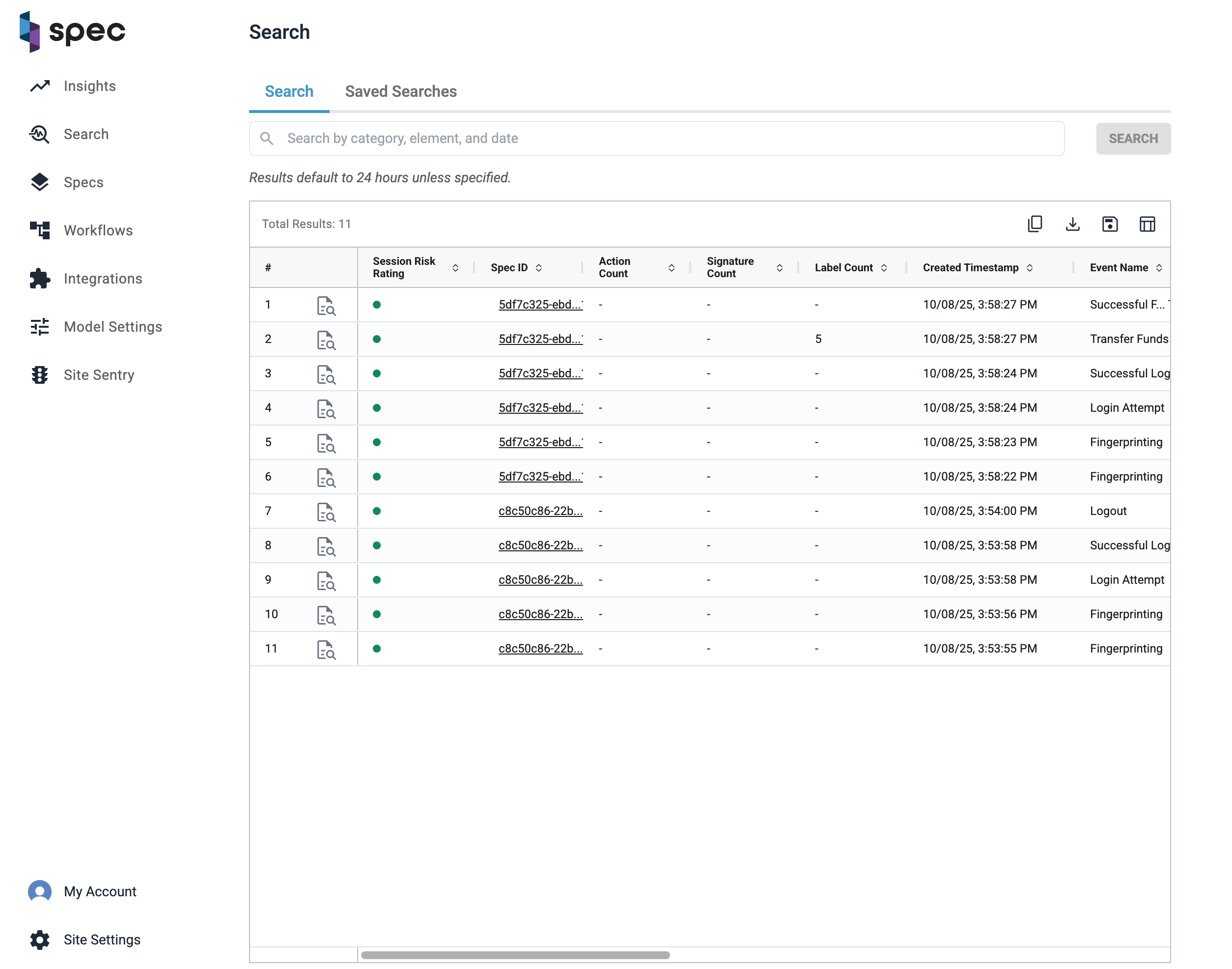 This page allows analysts to search through any session activity gathered by Spec. You can use this page as a launching point to find trends in user activity, save searches, download datasets, and continue to further investigate patterns made by fraudsters.